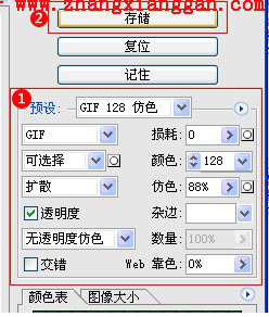 制作的过程中,注意把需要透明的地方选中(推荐用魔棒工具),然后按Del删除,见到一些灰白相间的网格则是代表透明部分。 作品完成以后,单击文件》储存为Web所用格式》如下配置: