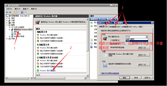 注:如图中(第三步)域配置文件、专用配置文件、公用配置文件防火墙,尽量全关闭,否则可能会影响Powrelay正常运行。