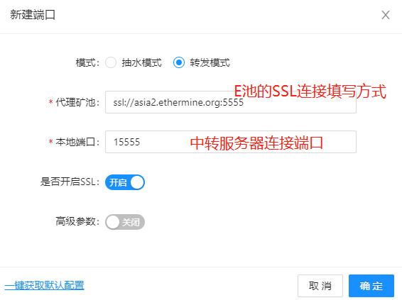 上图通过两次SSL实现了两次SSL加密,如果是鱼池不提供SSL连接的话可以在上面填写tcp的,这样的话是你的机器到中转服务器实现了SSL加密。