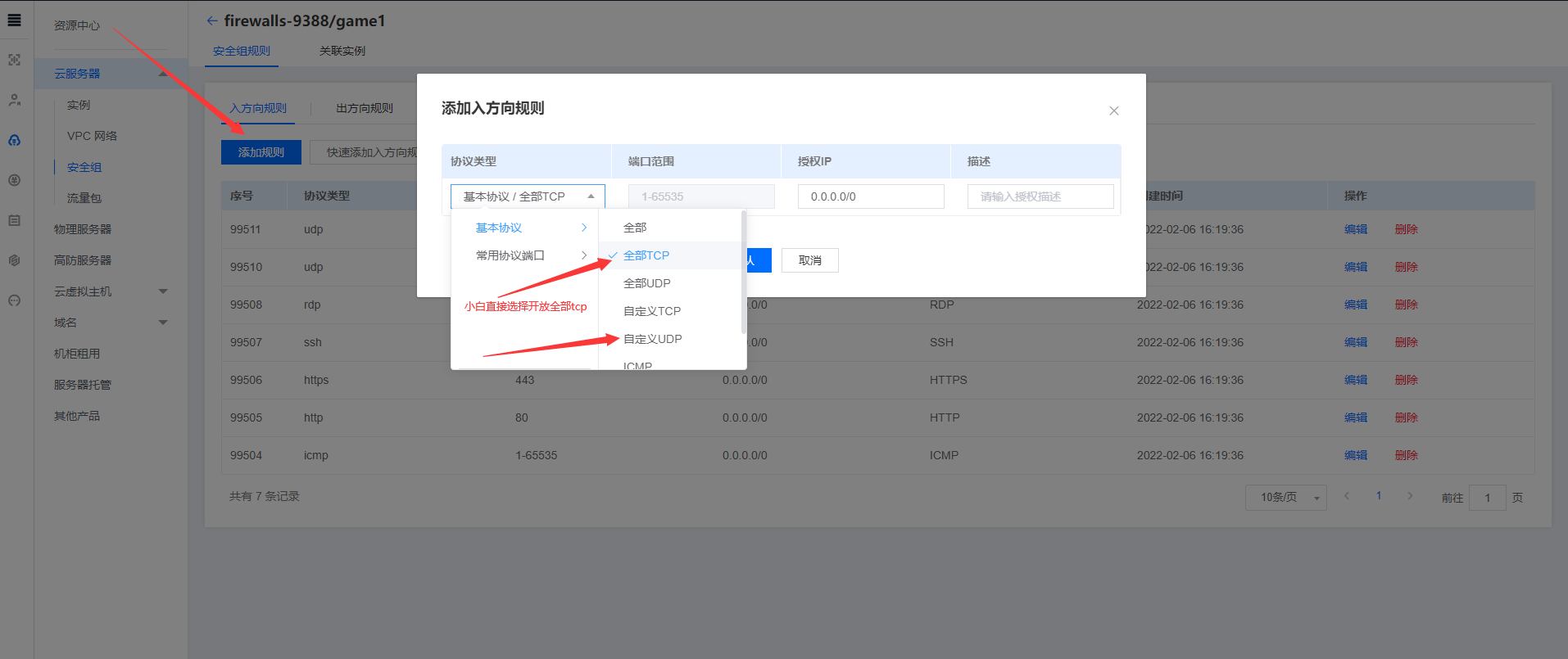 小白可以直接选择全部tcp,ICMP,高手可以制定开放自己要连接的端口。 这样
