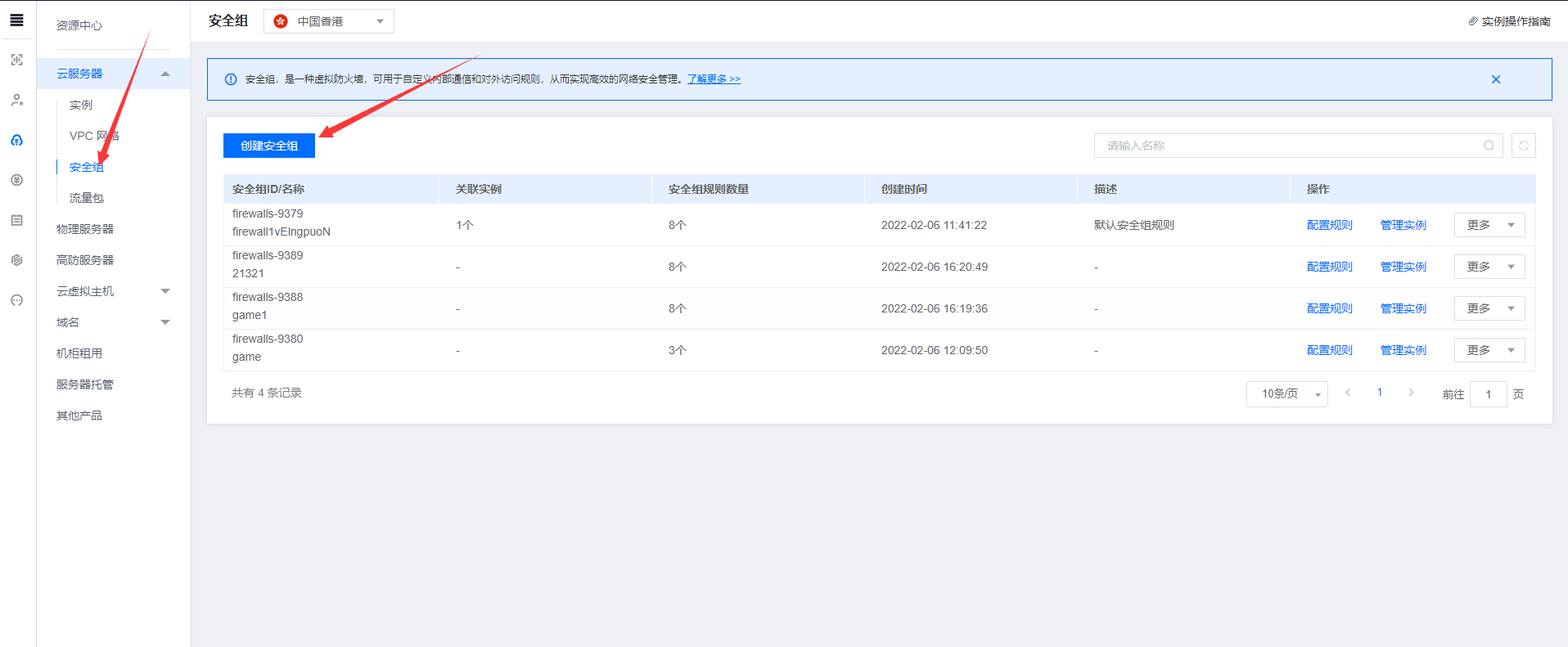 登录控制台,控制台左边图标点击资源中心,点击安全组,创建安全组。