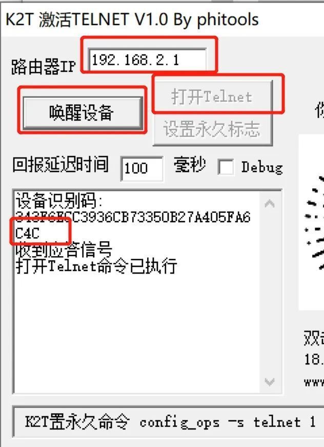 ①首先我们要用RoutAckK2TV1B1开启Telnet功能,先点唤醒,然后点击打开Telnet即可。【识别码结尾不是C4C的需要拆机了】