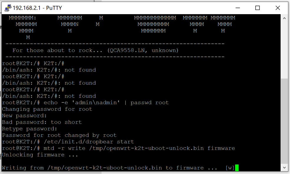 然后回到PuTTY将openwrt解锁包刷入路由器:
