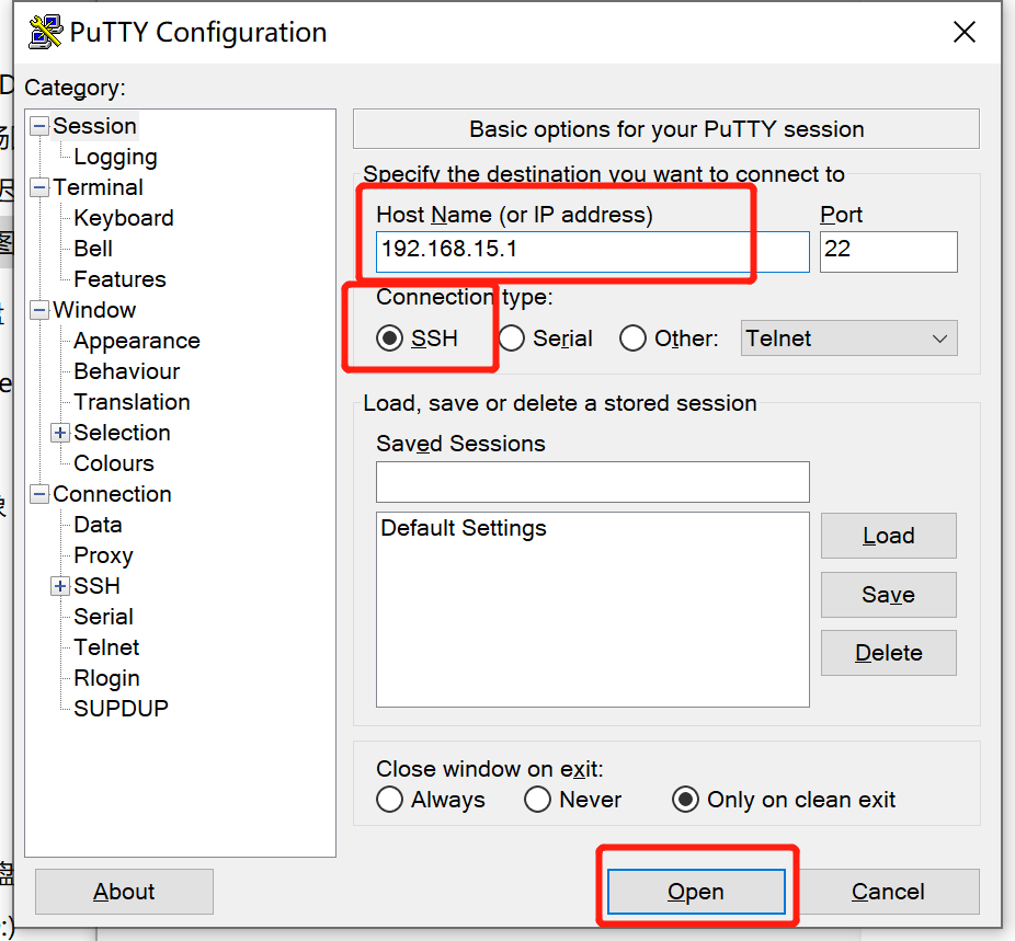 然后用差不多同样的方法写入路由器打开PuTTY,输入IP地址 192.168.15.1,选择连接类型SSH